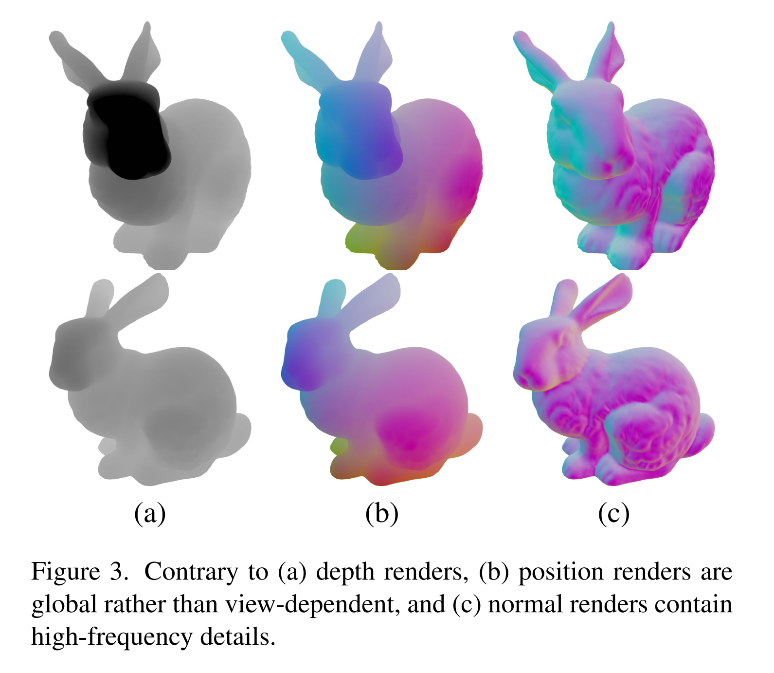 Both project onto a canonical system to provide geometry-invariant information. Using both coordinate and normal information maps both the spatial position and the relationships between positions. MetaTextureGen also uses the same guidance, reporting that the combination of point and normal is better than depth maps in terms of detail and global context.