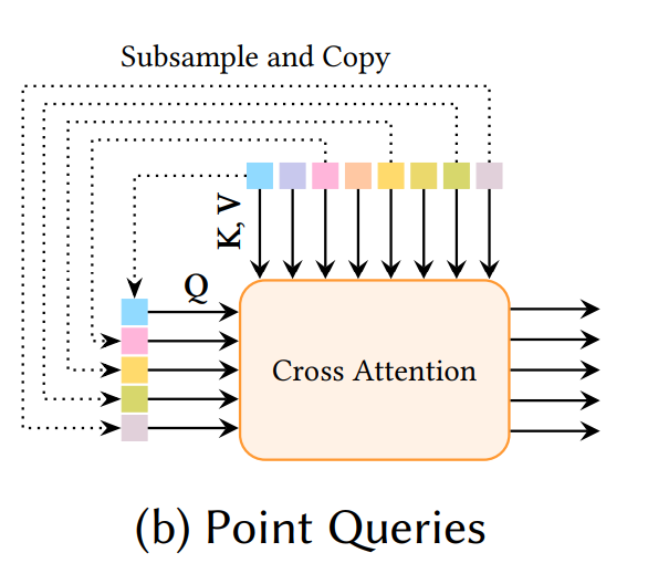 Point Query: It does not use the strategy of learnably learning the basis of the latent space as a latent vector set. Instead, it uses salient/uniform sampled points, subsampled, as queries.