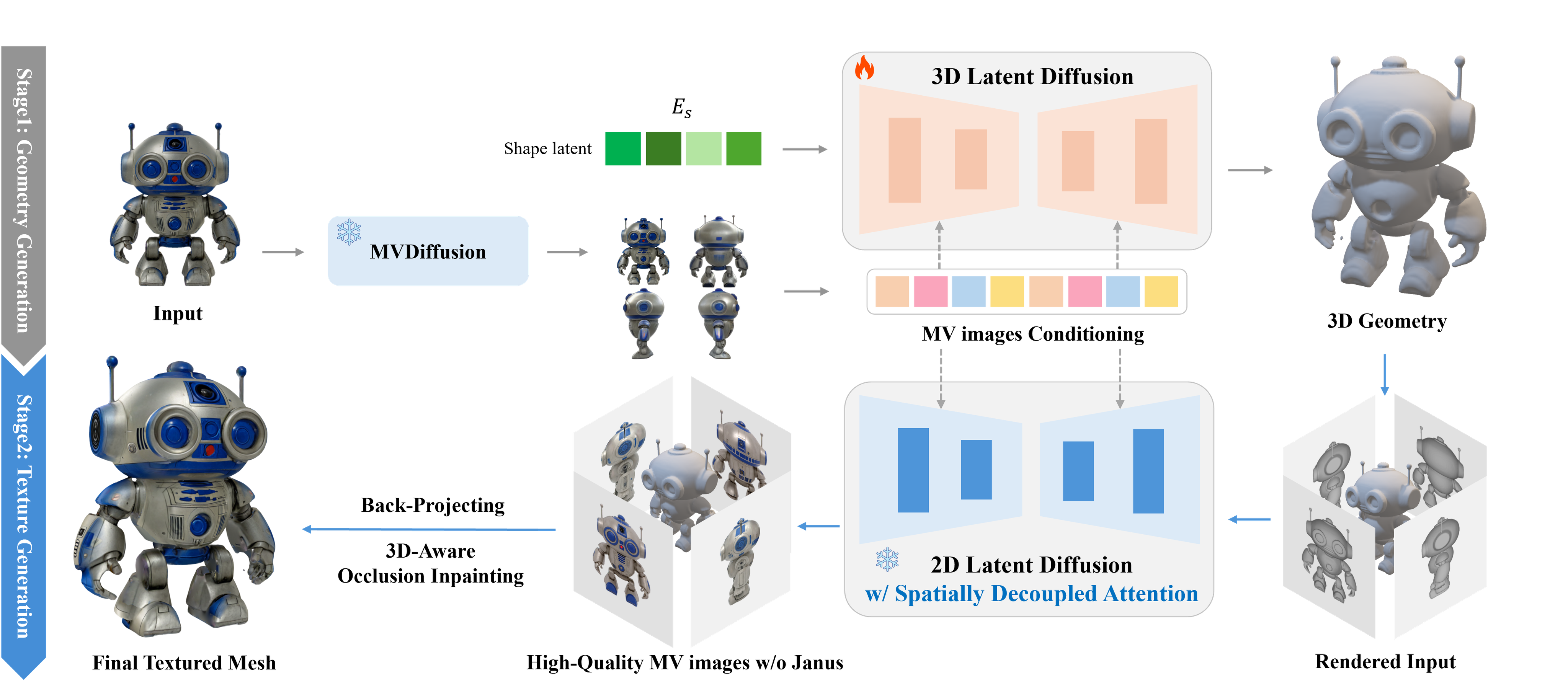 Since Hunyuan uses a 2-stage approach like CLAY/CaPa, it uses Geometry-guided Multi-View Generation for texture synthesis. However, it is not simply a combination of MVDream/ImageDream series models + MV-Depth/Normal ControlNet. Instead, it incorporates several novel strategies to improve quality.