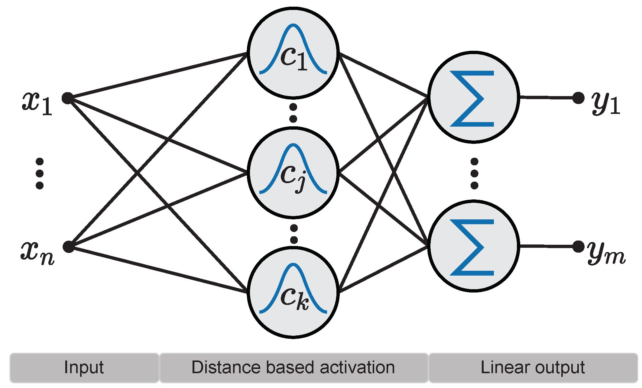 $$ f(x) \approx \sum_{i=1}^{N} w_i \phi(||x - c_i||) $$
