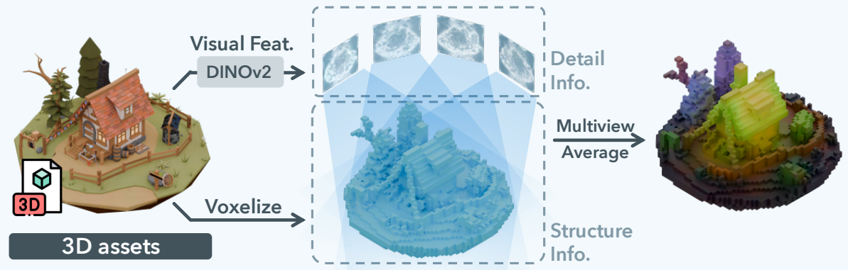 - 2) Feature Generation: Conditioned on the Sparse Structure generated in the first stage, a second model (a DiT-like Transformer) generates the SLAT, i.e., the projected DINO feature, corresponding to each activated voxel location. The training objective of this model is the highly complex mapping from 'Gaussian Noise → the projected DINO feature of the corresponding voxel'.
