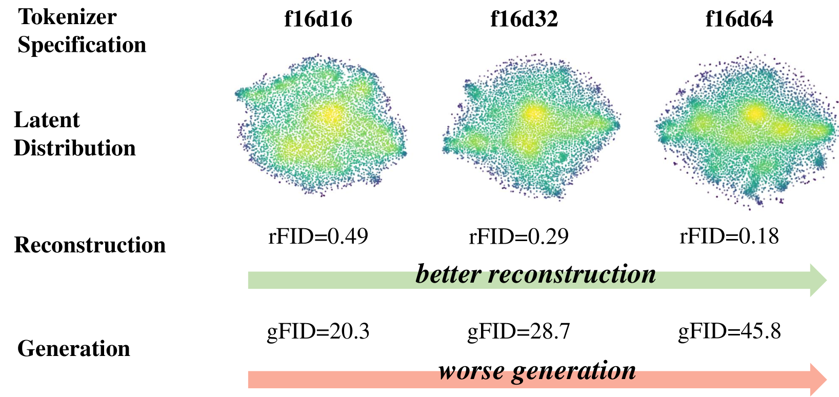 - As the VAE's latent space acquires a higher dimension, the original image reconstruction quality improves, but the performance of the generative model (DiT) that has to learn on this complex latent space actually degrades.