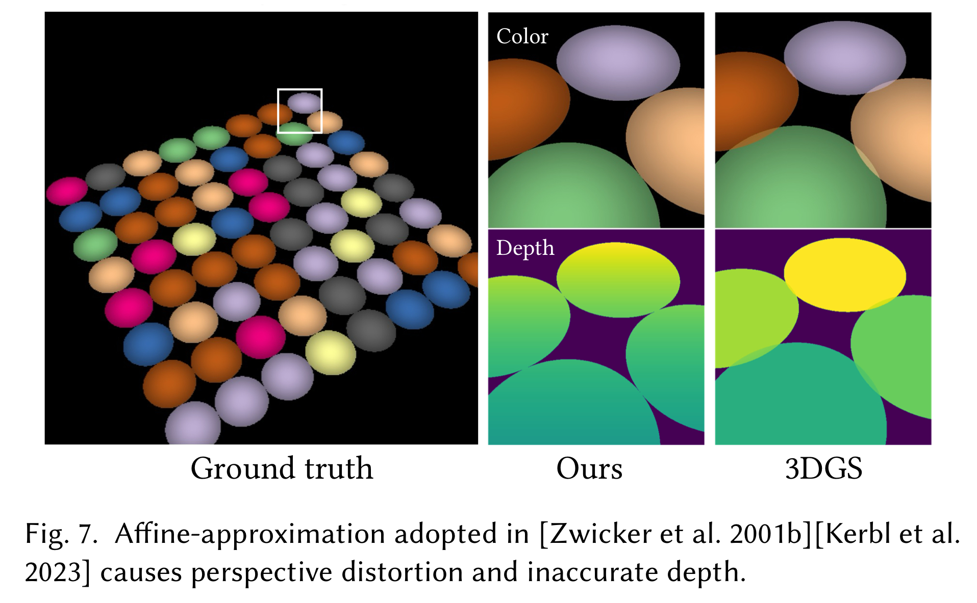Comparative figures in the supplementary material of the paper demonstrate that the homogeneous projection method in 2D GS is more accurate than the affine projection used in 3D GS.