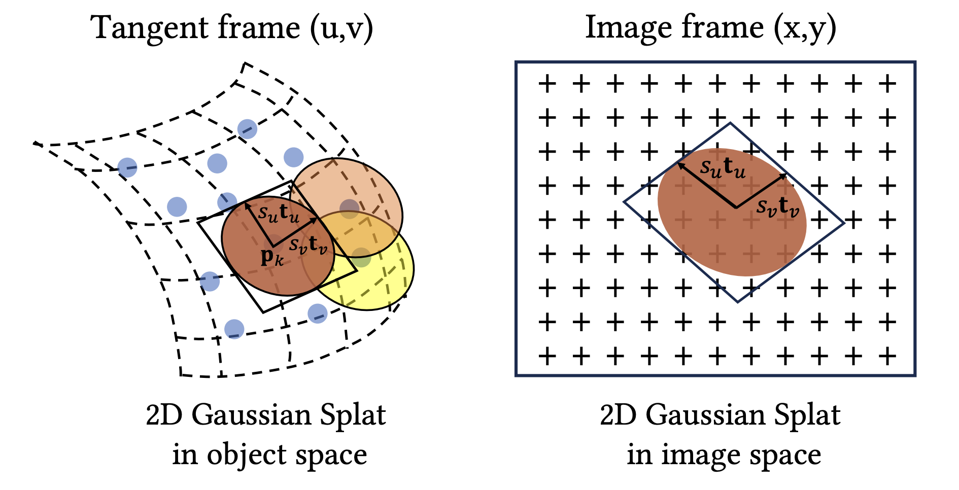 In this context, a 2D Gaussian is defined as a local tangent plane $P$ in the $uv$ coordinate frame which has center point $p_k$, tanget vector $(t_u, t_v)$.