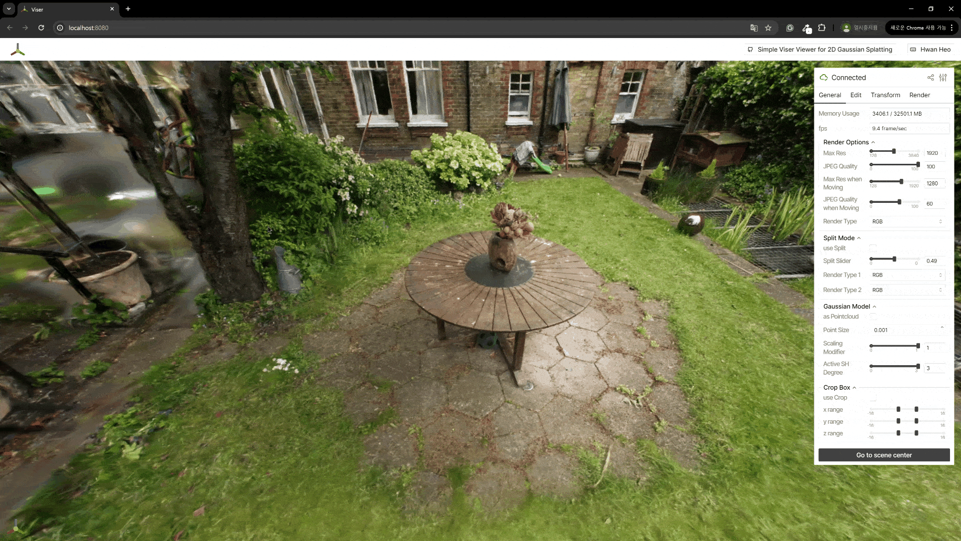 To overcome this limitation, I developed a custom viewer using Viser, which supports the homogeneous projection of 2D GS, eliminating projection errors. This viewer offers various visualization and editing functions, making it easier to monitor scene training and generate rendering camera paths.