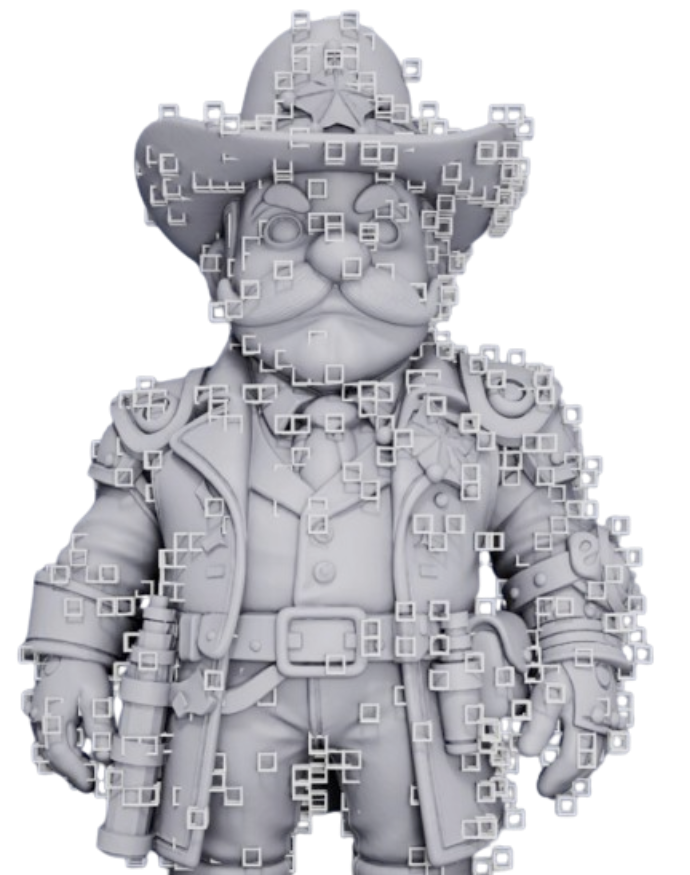 - Visualization of FlashVDM. When reconstructing the mesh on the Right through the VAE decoder, FlashVDM first identifies active voxels at a coarse resolution (Left → Right), then increases resolution only within the range of these active voxels to reconstruct high-resolution SDF.