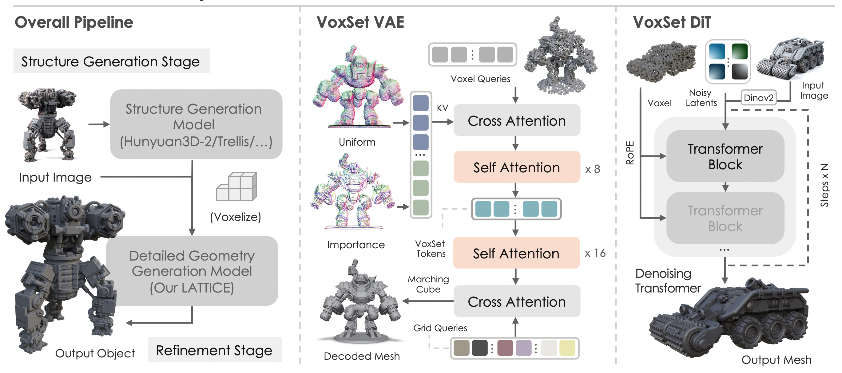 Lattice is the core structure behind Hunyuan3D 2.5/3.0's geometry generation model released by Tencent. Like Sparc3D and others, it applies a two-stage approach to the VecSet methodology—first generating a global shape, then using that result as guidance to generate local details. (In fact, considering the release timing of Hunyuan3D 2.5, it appears that Tencent internally validated and completed training on the coarse-to-fine structure much earlier than research like Sparc3D)