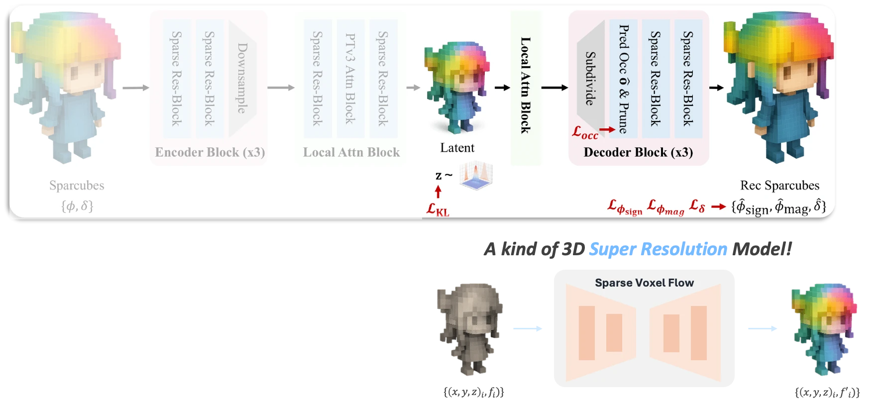 The secret behind this performance difference lies in the structural characteristics. As shown in the figure, the decoding of Sparse Voxel VAE maps a low-resolution sparse voxel latent grid to a high-resolution sparse voxel SDF grid. In other words, sparse voxel VAE is essentially a form of '3D super-resolution.'