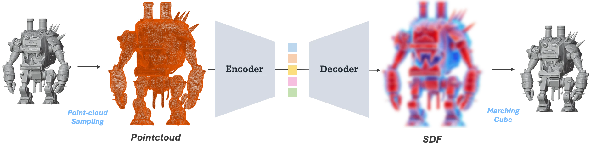 Around that time, on another axis of 3D generation research, 3D diffusion model research using 3D Native VAE was expanding. This approach, represented by 'VecSet VAE,' is a VAE structure that compresses point clouds sampled from polygonal meshes into a latent space and then reconstructs an SDF field from that space. (For details, refer to The Era of 3D Generative Models)