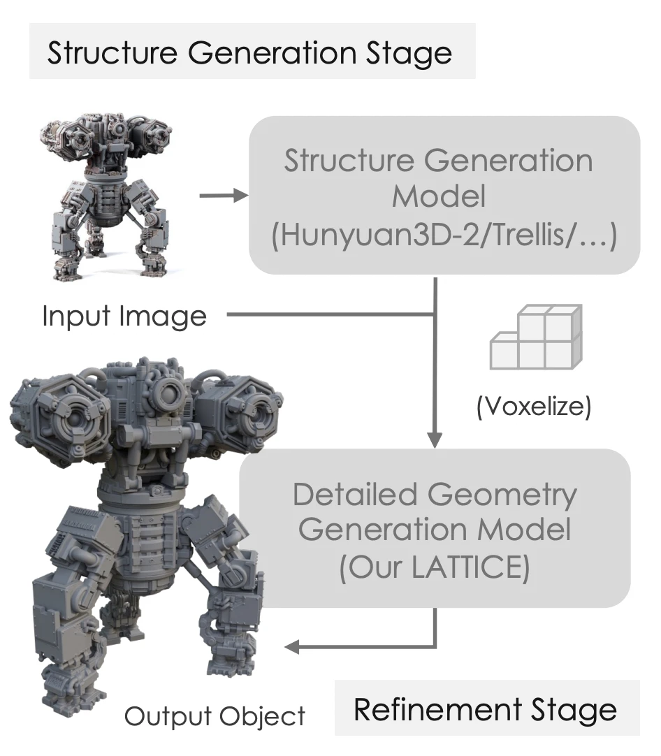Lattice is the core structure behind Hunyuan3D 2.5/3.0's geometry generation model released by Tencent. Like Sparc3D and others, it applies a two-stage approach to the VecSet methodology—first generating a global shape, then using that result as guidance to generate local details. (In fact, considering the release timing of Hunyuan3D 2.5, it appears that Tencent internally validated and completed training on the coarse-to-fine structure much earlier than research like Sparc3D)