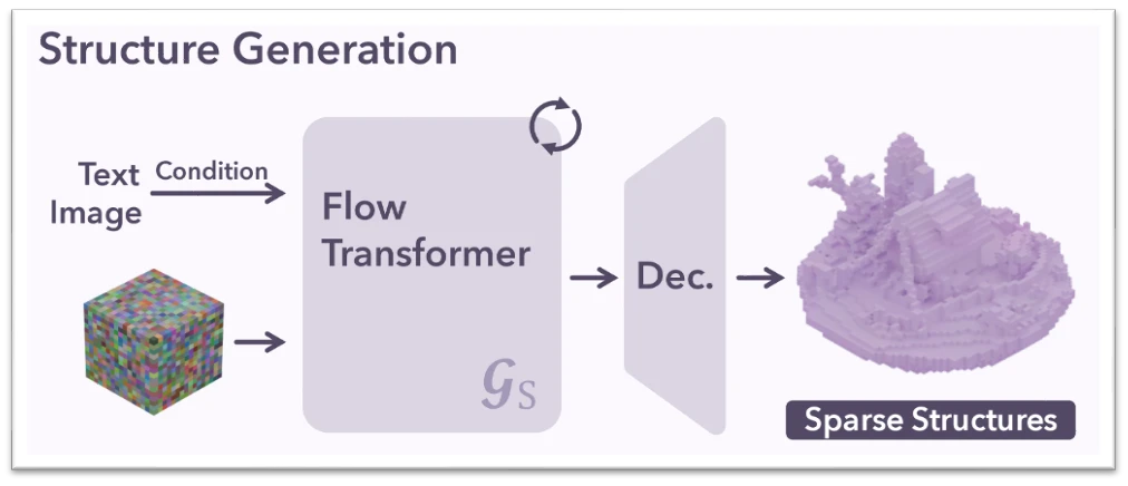 Trellis, which pioneered the direction of sparse voxel-based 3D generation, uses a separately designed model for this purpose. However, to use this model for mesh generation at resolutions of $1024^3$ or higher rather than the existing $256^3$, the resolution of active voxels also needed to be raised to the $128^3$ level, which caused serious computational issues.